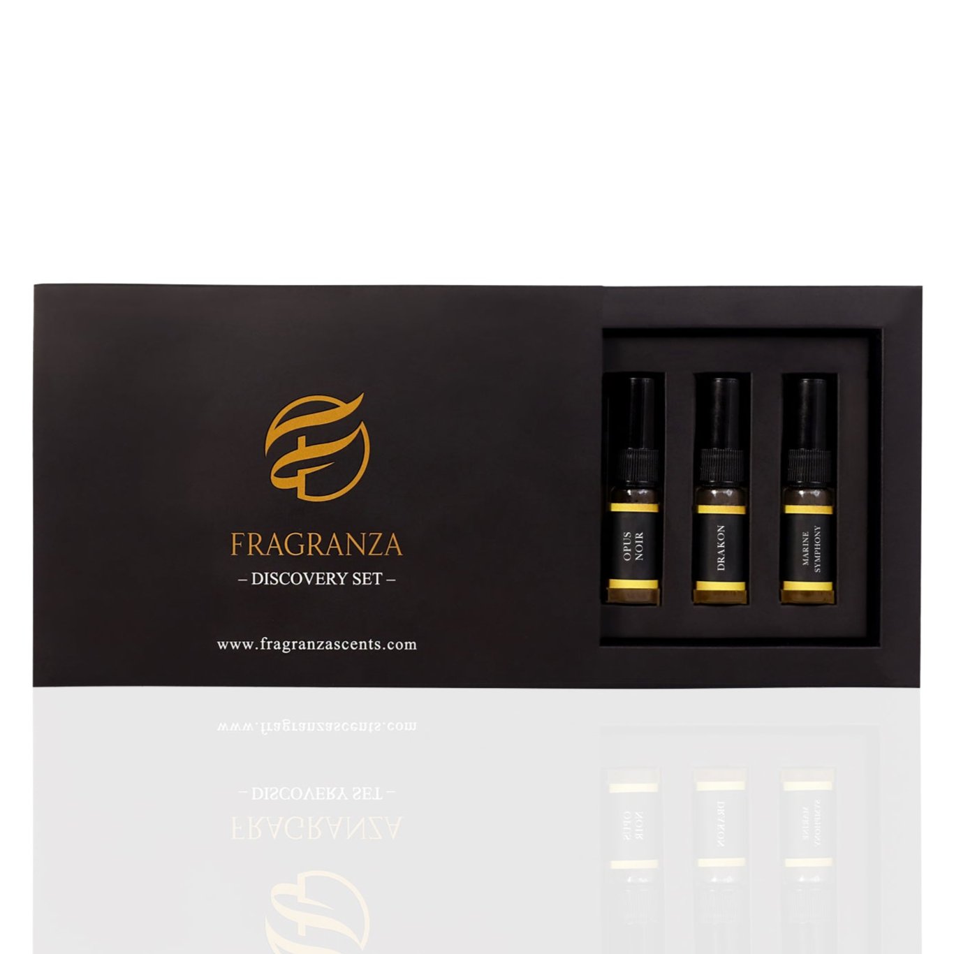 Uncover five distinctive scents with our Male Discovery Set. Experience the bold Rosewood, elegant Imperial Essence, refined Opus Noir, daring Drakon, and fresh Marine Symphony. Each 3ml tester offers a unique take on masculine sophistication.