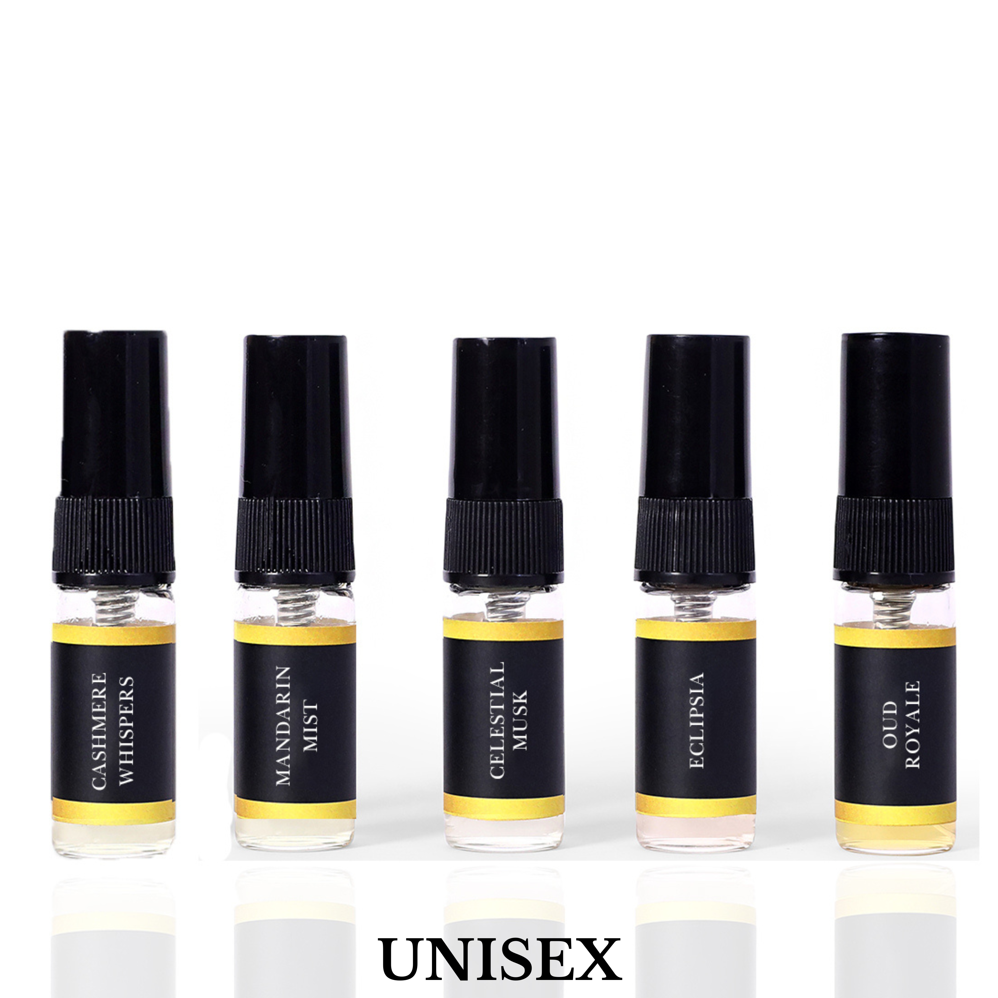 Discover versatile elegance with our Unisex Discovery Set. Enjoy five 3ml testers, including the luxurious Cashmere Whispers, vibrant Mandarin Mist, and intriguing Celestial Musk. Eclipsia offers a bold touch, while Oud Royale brings a rich, opulent aroma. Perfect for any scent preference.